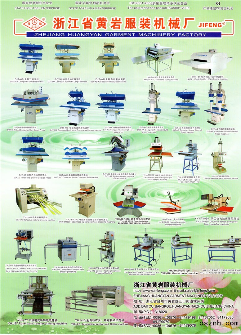 浙江省黃巖服裝機械廠 熱轉印印花設備_冷轉印壓花設備_整燙粘合設備點擊:375 查看原圖![]() ![]() ![]() 浙江省黃巖服裝機械廠