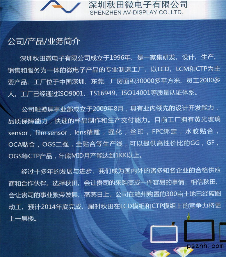 深圳秋田微電子股份有限公司 深圳市龍崗區橫崗荷坳金源工業區金源路39號 電話:+86-755-8886 0696 傳真:+86-755-2691 1092 郵箱:sales@av-display.com 網站:www.av-display.com |