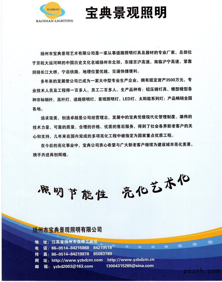 揚州市寶典景觀照明有限公司 電 話|0514-85083789 傳 真|0514-85083786 郵 編|225651 地 址|江蘇 揚州 高郵市 揚州市北郊送橋工業園區 公司主頁|http://www.bdzm66.com 其它聯系方式|13773309518 |