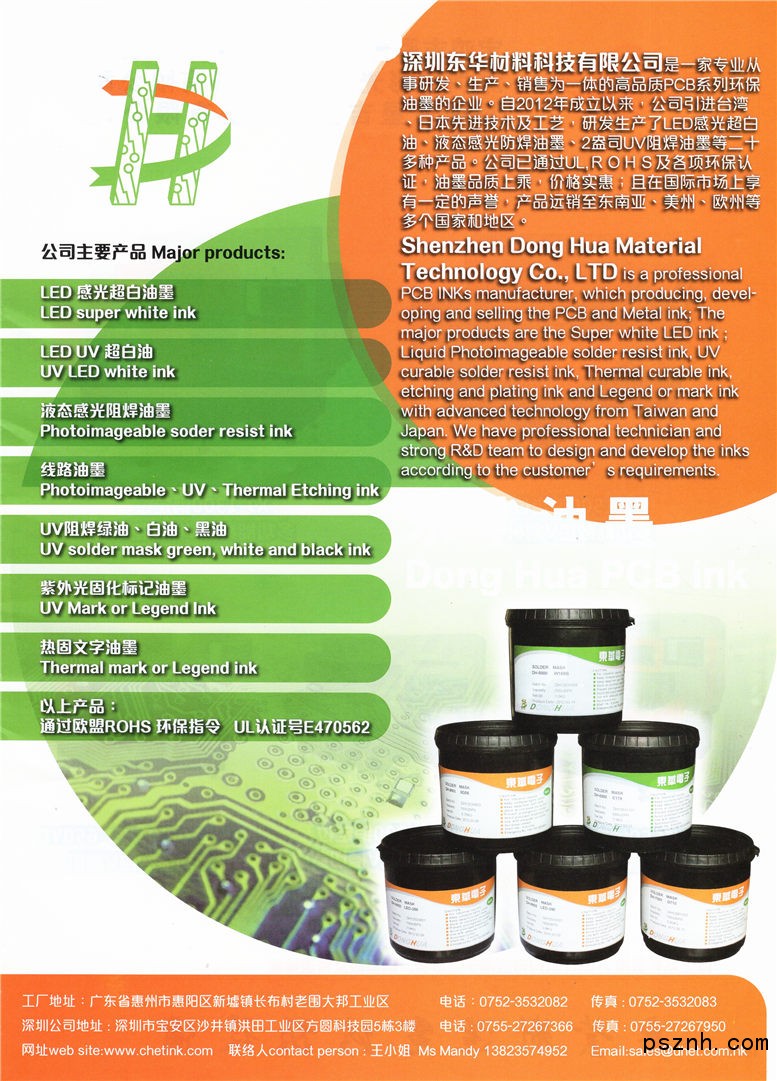 深圳東華材料科技有限公司 鋁基板白油 液態(tài)感光防焊油墨 2盎司UV阻焊油墨點擊:1219 查看原圖![]() ![]() ![]() 深圳東華材料科技有限公司