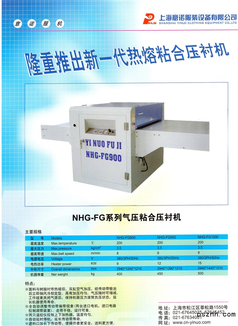 上海意諾服裝設備有限公司 小型粘合機 自動調偏粘合機 特氟龍輸送帶點擊:454 查看原圖![]() ![]() ![]() 上海公司地址