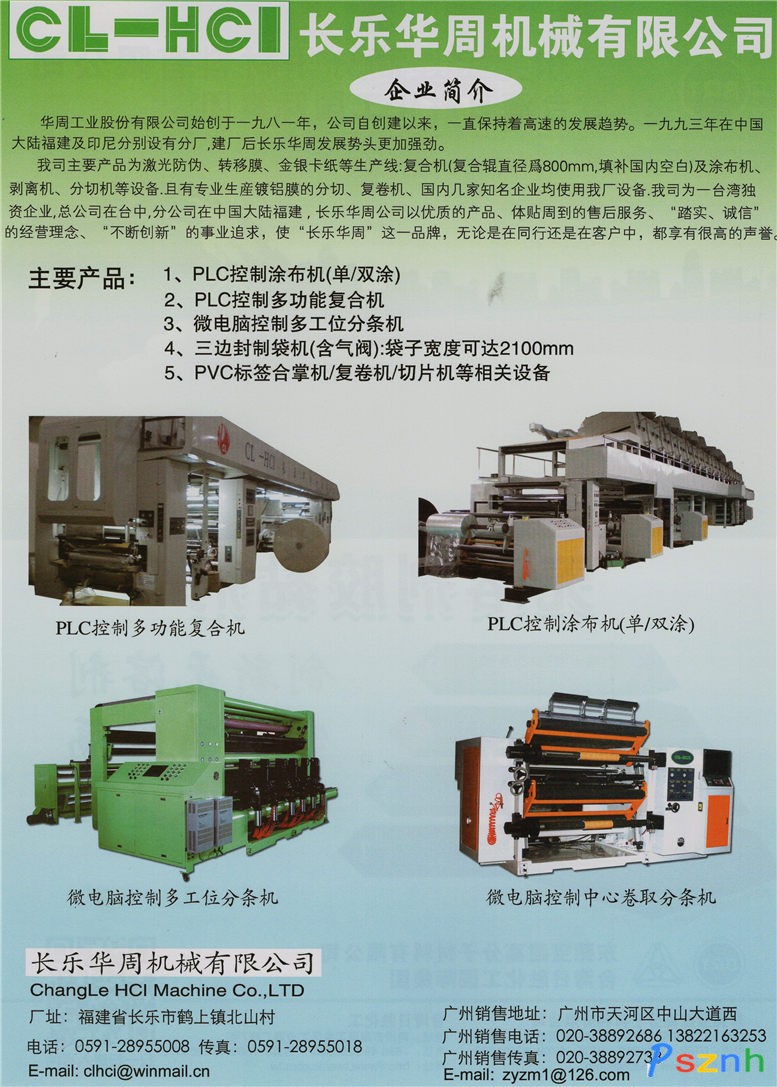 長樂華周機械有限公司 印刷機械_干/濕復合機_涂布機_擠出複合、分切和制袋等機械設備點擊:615 查看原圖![]() ![]() ![]() 長樂華周機械有限公司