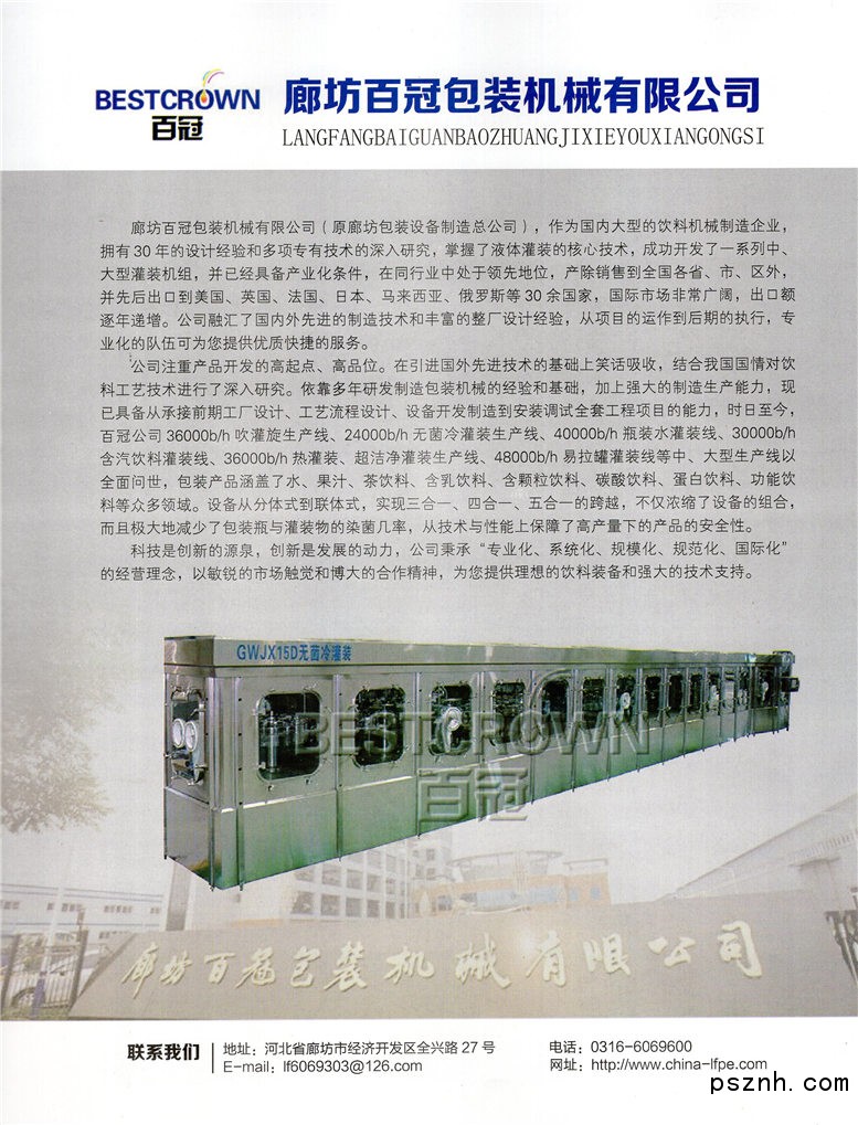 廊坊百冠包裝機械有限公司 超潔凈系統 熱灌裝純汁生產線 飲用水5L大瓶水點擊:500 查看原圖![]() ![]() ![]() 地址:河北廊坊經濟開發區全興路27號