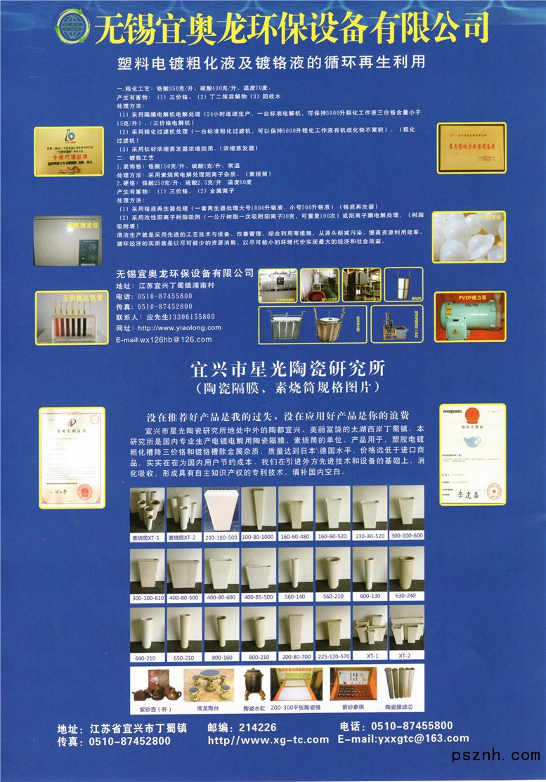 宜興市星光陶瓷研究所 塑料電鍍粗化槽三價鉻再生、粗化液過濾以及電鍍鉻槽除雜素燒筒(陶瓷隔膜)點擊:519 查看原圖![]() ![]() ![]() 宜興市星光陶瓷研究所 地址:江蘇省宜興市大浦鎮湖濱路(大浦加油站對面) 電話:0510-87455800 傳真:0510-87452800 手機:13306155800 http:// www.xg-tc.com E-mail:yxxingguang@163.com |