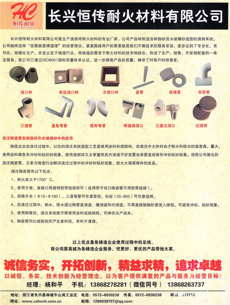 長(zhǎng)興恒傳耐火材料有限公司 兩通扁澆口 鑄造用三通耐火陶瓷管 碳化硅過(guò)濾網(wǎng)點(diǎn)擊:490 查看原圖![]() ![]() ![]() 手機(jī):13868278281