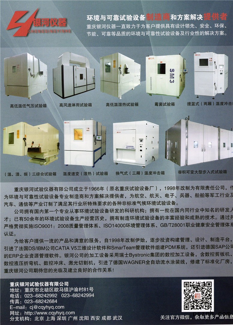 重慶銀河試驗儀器有限公司_高溫試驗箱_霉菌試驗箱_高低溫試驗箱_三綜合試驗箱_高低溫低氣壓箱_溫度沖擊試驗箱_太陽輻射試驗箱_高低溫濕熱試驗箱_高風速淋雨箱點擊:1200 查看原圖![]() ![]() ![]() 重慶銀河試驗儀器有限公司電 話|023-68347700傳 真|023-68314281郵 編|400712地 址|重慶 北碚區 北碚區滬渝村81號