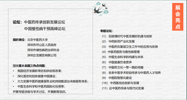 北京中醫藥大學是我國實現中醫藥產業創新發展、傳播中醫藥文化、學術支撐權威機構,大學與眾多中醫藥龍頭企業均有合作,國內重要的中醫院領導和技術專家多畢業于北京中醫藥大學,大學成功舉辦數場高端的學術論壇、技術交流和培訓活動。本屆展會和論壇由大學和坪山政府聯合主辦,將邀請國內外國醫大師和知名專家演講。是行業學術技術層面高、展會規模大、最權威的展示、交流平臺。