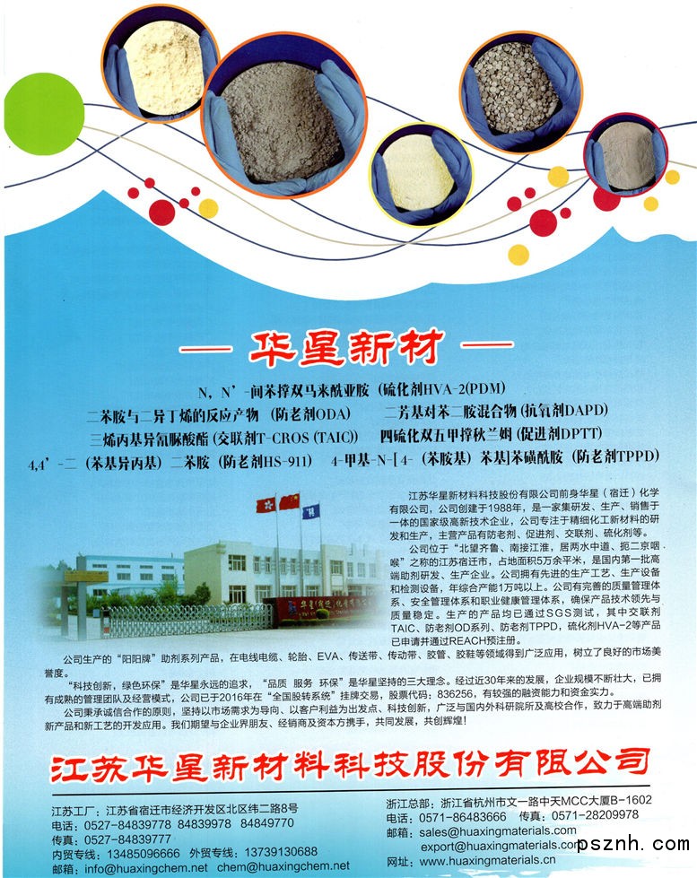江蘇華星新材料科技股份有限公司 防老劑、促進劑、交聯劑、硫化劑點擊:450 查看原圖![]() ![]() ![]() 公司名稱: 江蘇華星新材料科技股份有限公司