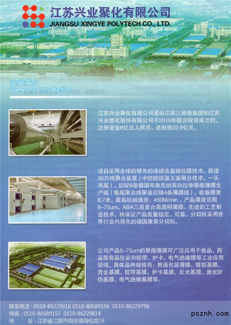 江蘇興業聚化有限公司 鍍鋁基膜、燙金基膜、膠帶基膜、護卡基膜點擊:401 查看原圖![]() ![]() ![]() 郵政編碼214423