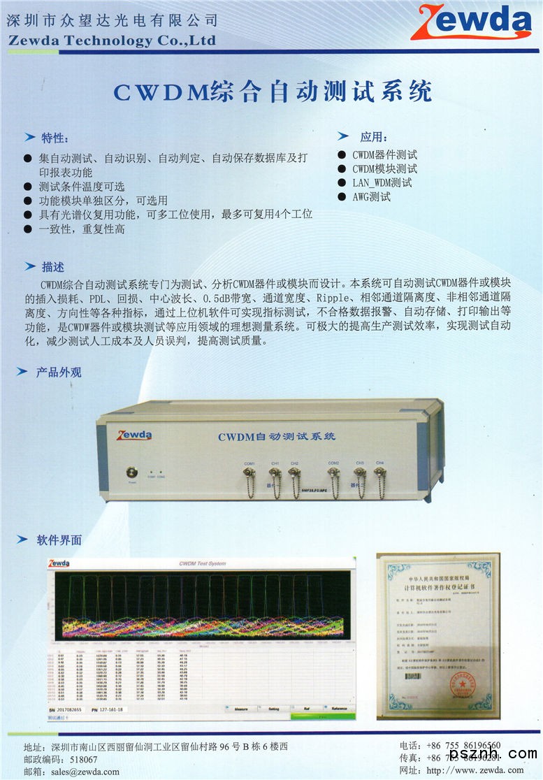深圳市眾望達光電有限公司 CWDM綜合自動測試系統點擊:459 查看原圖![]() ![]() ![]() 聯 系 人:黃懷英