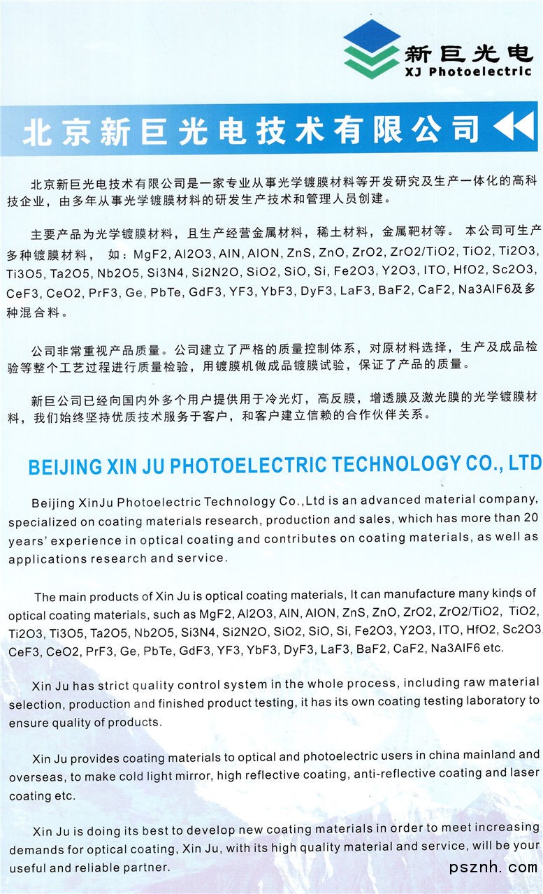 北京新巨光電技術(shù)有限公司 金屬材料_稀土材料_靶材點(diǎn)擊:555 查看原圖![]() ![]() ![]() 公司地址: