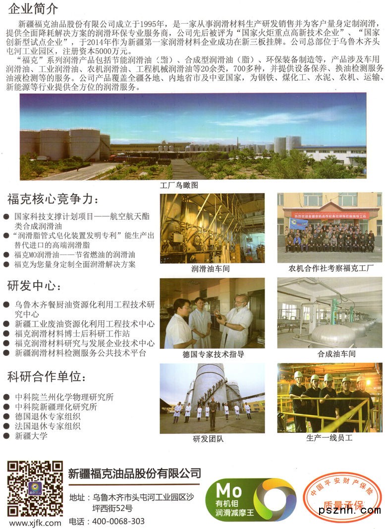 新疆福克油品股份有限公司 設節能潤滑油(脂)_合成型潤滑油(脂)_環保裝備制造點擊:699 查看原圖![]() ![]() ![]() 中國 .新疆烏魯木齊市開發區(頭屯河區)工業園區沙坪西街52號