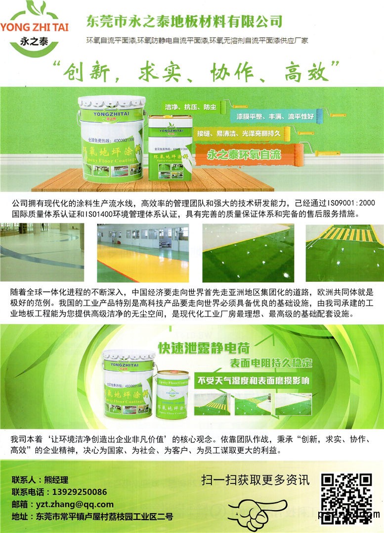 東莞市永之泰地板材料有限公司 工業環氧自流平面漆 環氧防靜電自流平面漆 環氧平涂面漆點擊:576 查看原圖![]() ![]() ![]() 專業從事現代化工業環氧自流平面漆、環氧防靜電自流平面漆、環氧平涂面漆專業研發地板材料及底、中涂、綠色專用、透明固化劑、代理南亞128樹脂、設計、生產、銷售、施工、服務為一體