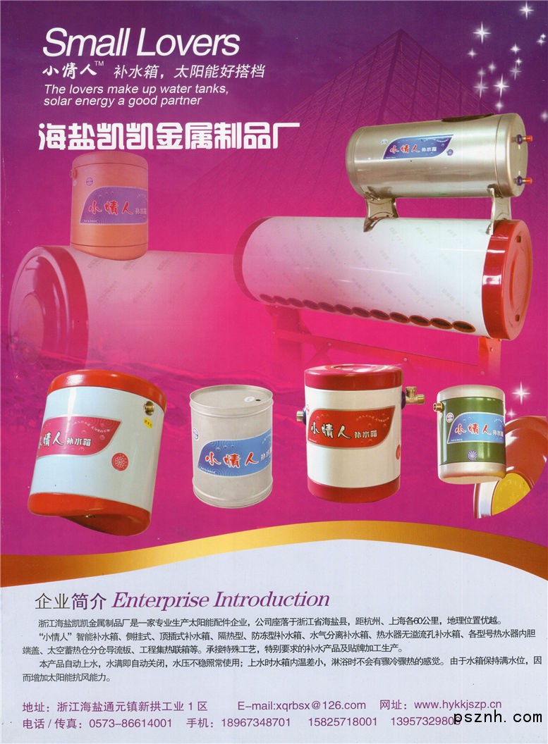 海鹽凱凱金屬制品廠 太陽能配件 頂插式補水箱點擊:425 查看原圖![]() ![]() ![]() 地 址:浙江省海鹽通元鎮新拱工業1區