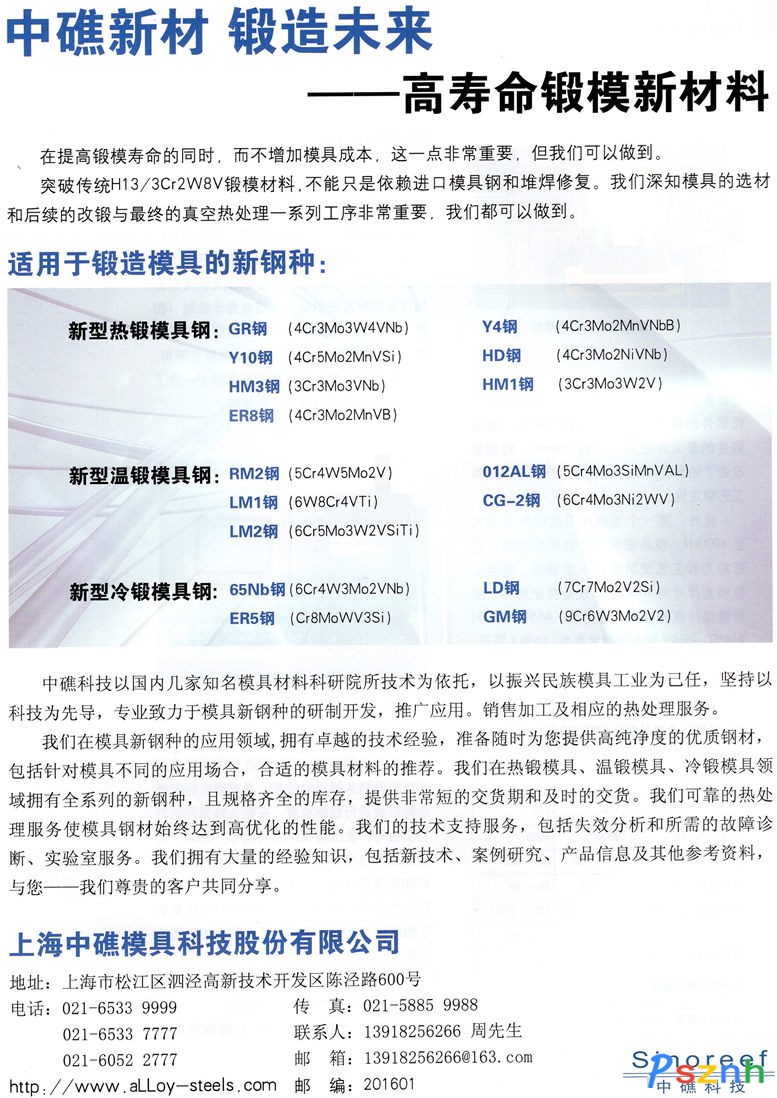 上海中礁模具科技股份有限公司 新型熱作模具鋼 新型冷作模具鋼 新型溫鍛模具鋼點擊:2238 查看原圖![]() ![]() ![]() 上海中礁模具科技股份有限公司 地址:上海市松江區泗涇高新技術開發區陳涇路600號 電話:021-65339999 65337777 傳真:021-58859988