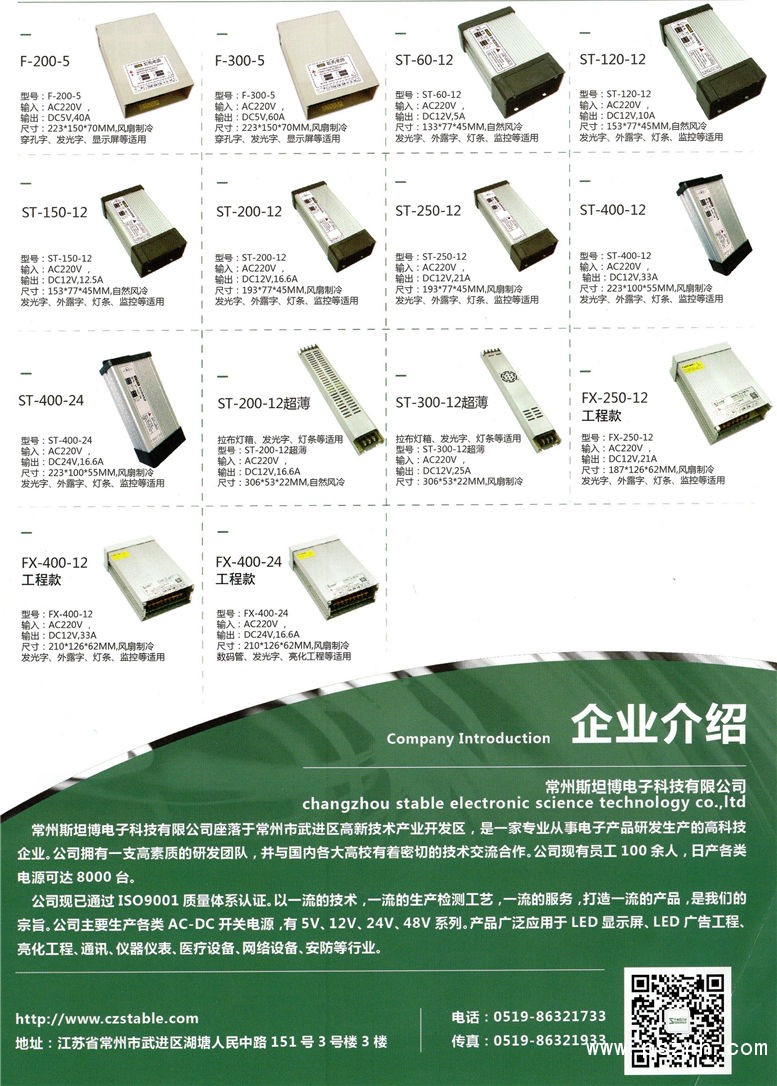 常州斯坦博電子科技有限公司 ST-400-24型材防雨電源 ST-400-12型材防雨電源 ST-200-12超薄燈箱電源點擊:725 查看原圖![]() ![]() ![]() 電 話 0519-86321733 傳 真 0519-86321933 網 址 www.czstable.com 郵 箱 530305062@qq.com 地 址 常州市武進區高新技術開發區人民中路151號3號樓3樓 |