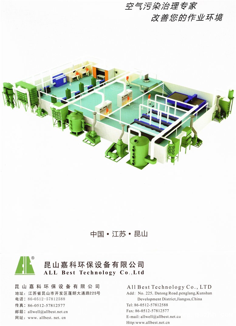 | 公司簡介: | 昆山嘉科環保設備有限公司成立于1999年,公司總部位于臺灣,是一家致力于工業粉塵、廢氣處理系統設計、制造、安裝于一體的專業化公司。公司擁有專業的技術研發、規劃設計、設備制造、施工安裝、產品銷售和售后服務團隊。公司擁有6000多平米的加工中心,國際先進的各種數控加工設備,以及各類專業的技術人員,具備很好的產品研發能力、生產能力和質量保障體系。公司已通過了ISO9001:2008 質量體系認證及多項國家專利。公司現有員工80余人,其中專業研發設計人員10名、生產高級技術人員5名;公司擁有專業的施工隊,專門的售后服務部門。公司服務了很多世界五百強企業及國內百強企業。目前在國內有眾多外資、民營、上市公司使用我公司提供的粉塵、廢氣處理設備和提供相關售后服務。例如巴斯夫(BASF)、艾仕得(Axaltatl)、阿克蘇.諾貝爾(Akzo.Nobel)、帝斯曼(DSM)、杜邦(DuPont)、拜耳(BAYER)、瓦克(WACKER)、朗盛(LANXESS)、老虎(TIGER)、PPG、索爾維(Solvay)、優美科(UMicore)、嘉寶莉(Carpoly)、三棵樹(Skshu)、君子蘭(Clivia)、長潤發(CRF)、金利泰(KNT) 等公司。嘉科公司為廣大客戶提供了設計合理、品質優異、經濟節能的環保項目工程并得到廣大客戶的認同。我公司設備還出口日本、韓國、俄羅斯、越南等國家。公司目前正在努力開拓國際市場,讓“ALL BEST”品牌走出國門走向世界,逐步實現“做百年企業,創世界品牌”的宏偉愿景。