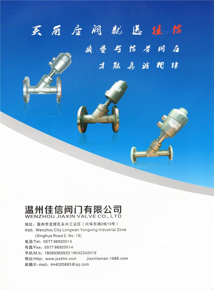 溫州佳信閥門有限公司 法蘭氣動角座閥 塑料頭衛生級快裝角座閥 氣動角座閥點擊:782 查看原圖![]() ![]() ![]() 溫州市龍灣永興錦宏閥門廠