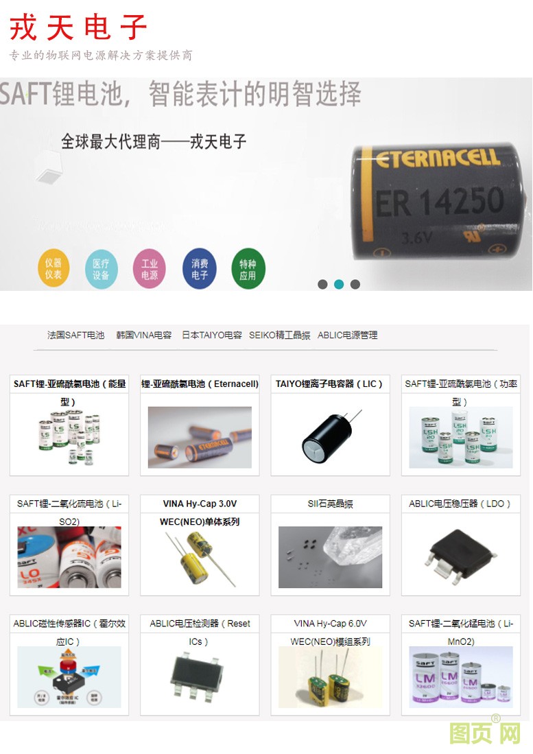 戎天電子(上海)有限公司-SAFT一次性鋰電池和可充電電池系列;VINA和TAIYO超級電容系列;鋰離子超級電容系列;ABLIC電源管理芯片和鋰電保護芯片;可充電電池組(可按照客戶要求定制)。點擊:719 查看原圖![]() ![]() ![]() 簡介: