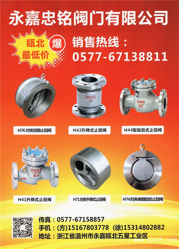 永嘉縣忠銘閥門有限公司 旋啟止回閥 對夾止回閥 升降式止回閥點擊:647 查看原圖![]() ![]() ![]() 永嘉縣忠銘閥門有限公司: