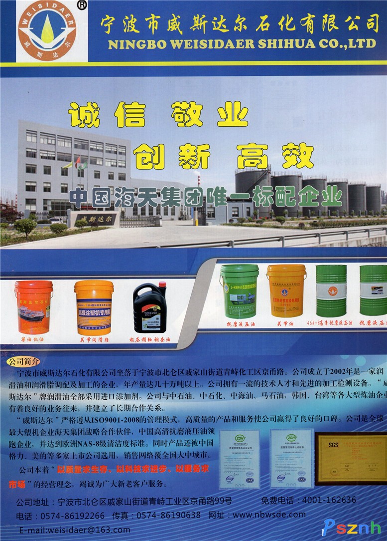 寧波市威斯達爾石化有限公司_DCB船用中速筒狀活塞柴油機油_抗磨液壓油_化驗設備展示點擊:1589 查看原圖![]() ![]() ![]() 地址:寧波市北侖戚家山街道京甬路99號