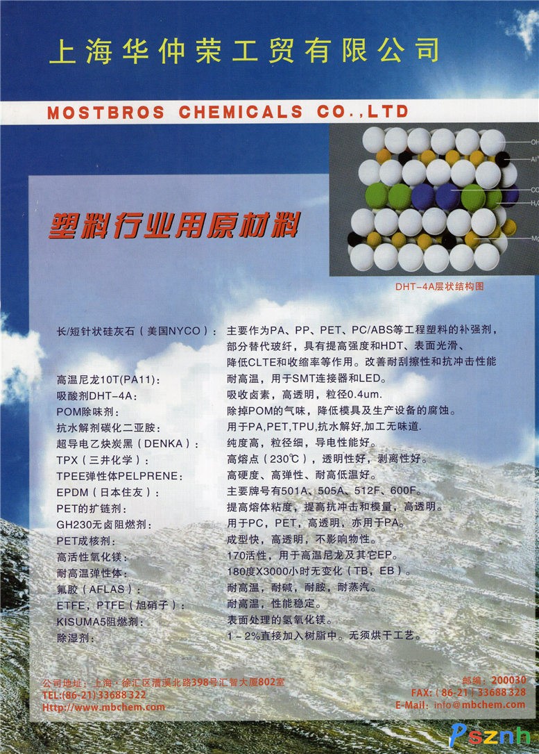 上海華仲榮工貿(mào)有限公司 田岡化學(xué)助劑 玻纖處理劑 抗靜電導(dǎo)電產(chǎn)品 抗衰老劑多胺點(diǎn)擊:1631 查看原圖![]() ![]() ![]() 電話:+86-21-33688322 傳真:+86-21-33688328 電子郵件:info@mbchem.com 公司網(wǎng)址:www.mbchem.com |
