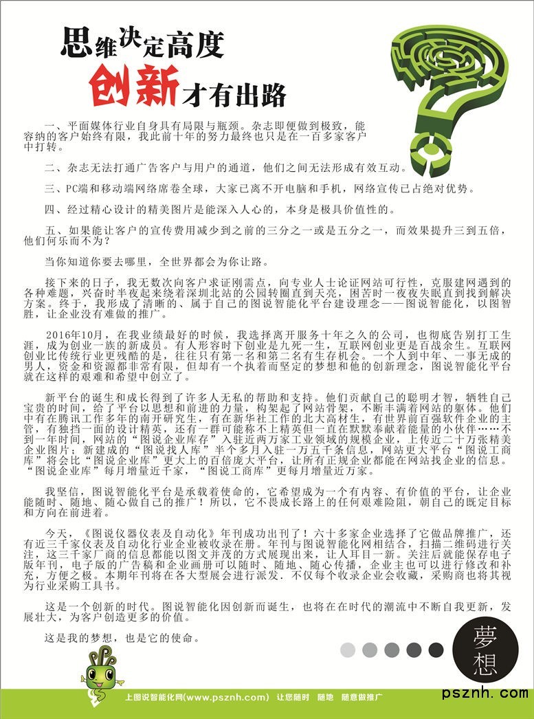 今天,《圖說(shuō)儀器儀表及自動(dòng)化》年刊成功出刊了!六十多家企業(yè)選擇了它做品牌推廣,還有近三千家儀表及自動(dòng)化行業(yè)企業(yè)被收錄在冊(cè)。年刊與圖說(shuō)智能化網(wǎng)相結(jié)合,掃描二維碼進(jìn)行關(guān)注,這三千家廠商的信息都能以圖文并茂的方式展現(xiàn)出來(lái),讓人耳目一新。關(guān)注后就能保存電子版年刊,電子版的廣告稿和企業(yè)畫冊(cè)可以隨時(shí)、隨地、隨心傳播,企業(yè)主也可以進(jìn)行修改和補(bǔ)充,方便之極。本期年刊將在各大型展會(huì)進(jìn)行派發(fā).不僅每個(gè)收錄企業(yè)會(huì)收藏,采購(gòu)商也將其視為行業(yè)采購(gòu)工具書。