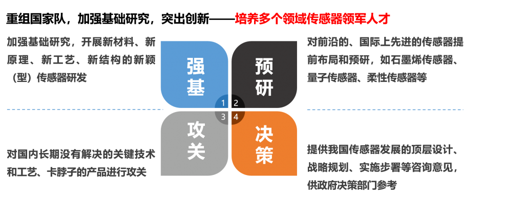 1、重組國家隊,加強基礎研究,突出創新——培養多個領域傳感器領軍人才。