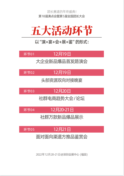 沸點私域大會,2022私域團長賽道年度盛典,第五屆全國團長大會暨第18屆社群團購大會以“讓每個企業都可以實現私域增長”為主題,以經驗交流+資源對接方式,以“會、展、演、宴、鑒”的形式,即舉辦1場趨勢大會(論壇)+萬款商品展示(選品會)+新品爆品路演會+頭部私域資源對接晚宴+面對面向私域渠道推品鑒賞,5大環節保障鏈接效果,促進供需雙方的高效對接。