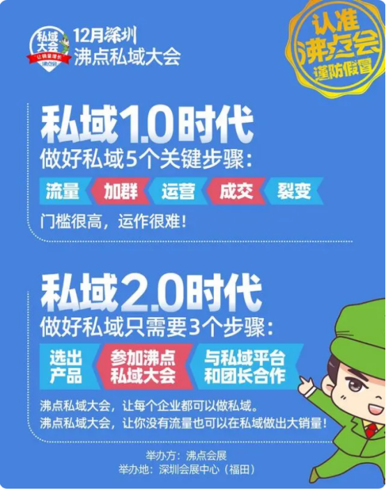 私域1.0時代,做好私域5個關鍵步驟:流量-加群-運營-成交-裂變門檻很高,運作很難。私域2.0時代,做好私域只需要3個步驟:選出產品-參加沸點私域大會-與私域平臺和團長合作。沸點私域大會,讓每個企業都可以做私域。