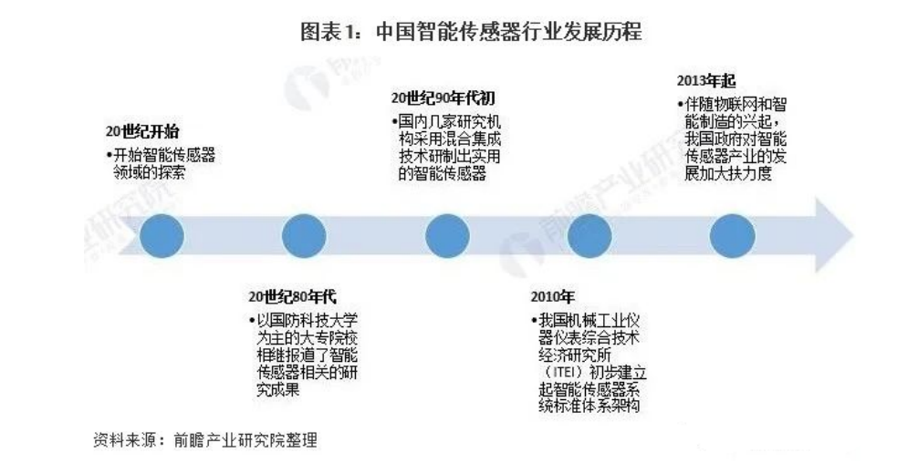 ⒈中國智能傳感器行業發展加速傳感器自誕生以來,大致經歷了結構型、固體型、智能型三個階段,隨著各類技術的進步,前兩類傳感器逐漸無法滿足對數據采集、處理等流程的需求,融合了AI技術的智能傳感器開始受到關注。20世紀開始,我國開始智能傳感器領域的探索。20世紀80年代-2010年,我國對于智能傳感器的研究不斷深入。2013年起,智能傳感器行業扶持政策陸續出臺,重點為使傳感器及智能儀器儀表實現微型化、數字化、模塊化、網絡化;2017年,工信部制定了《智能傳感器產業三年行動計劃(2017-2019年)》,明確傳感器產業的發展目標和方向。伴隨物聯網和智能制造的興起,智能傳感器得到了廣泛地關注。