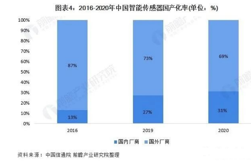 ⒋智能傳感器國產化率穩步提升我國國內廠商智能傳感器總產值占比從2016年的13%快速提升到2020年的31%,顯著高于行業增速,未來隨著國內廠商技術持續迭代、產品線進一步豐富、市場認知度持續提升,智能傳感器市場國產化率有望進一步提高。