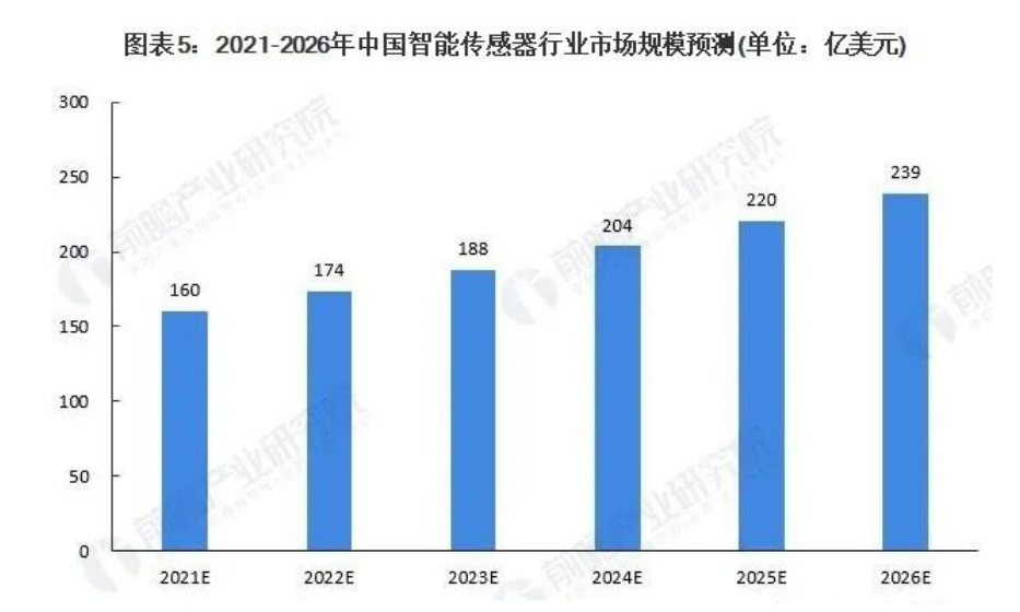 ⒌中國智能傳感器行業前景廣闊智能傳感器在工業4.0時代扮演著十分重要的角色。隨著物聯網在工業領域的應用推廣,智能傳感器在其中的應用越來越廣泛。物聯網、移動互聯網等新興產業的快速發展為智能傳感器行業帶來巨大發展契機。中國智能傳感器行業前景廣闊,預計到2026年中國智能傳感器行業市場規模將達239億美元。