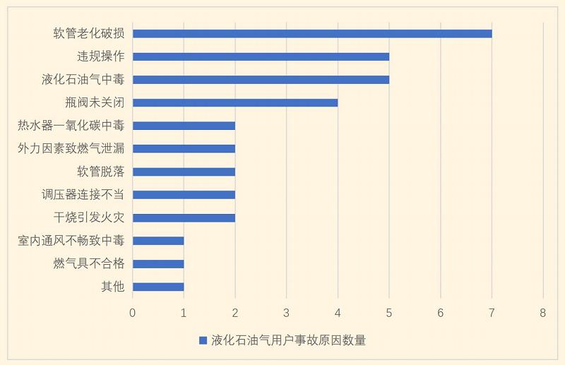 “報告”顯示(見上圖),2023上半年造成液化石油氣用戶事故最多的因素為:軟管老化破損、違規操作、液化石油氣中毒、瓶閥未關閉,其中軟管老化破損排第一位,這與液化石油氣瓶需要反復充裝、換瓶,軟管維護缺失等有很大關系。