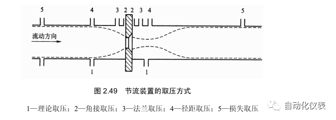 差壓式流量計是通過測量節(jié)流元件前后靜壓力差△ p 來實現(xiàn)流量測量的值與取壓孔位置和取壓方式緊密相關(guān)。根據(jù)節(jié)流裝置取壓口位置,取壓方式分為理論取壓、角接取壓、法蘭取壓、徑距取壓與損失取壓五種,如圖 2.49 所示。國家規(guī)定標(biāo)準(zhǔn)的取壓方式有角接取壓、法蘭取壓和 D-D/2 取壓。