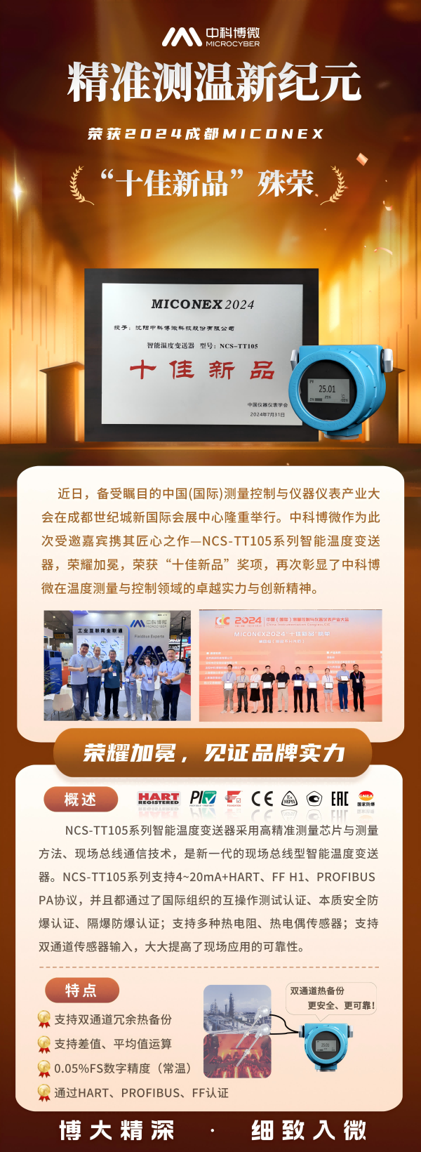 近日,備受矚目的中國(國際)測量控制與儀器儀表產業大會在成都世紀城新國際會展中心隆重舉行。中科博微作為此次受邀嘉賓攜其匠心之作—NCS-TT105系列智能溫度變送器,榮耀加冕,榮獲“十佳新品”獎項,再次彰顯了中科博微在溫度測量與控制領域的卓越實力與創新精神。