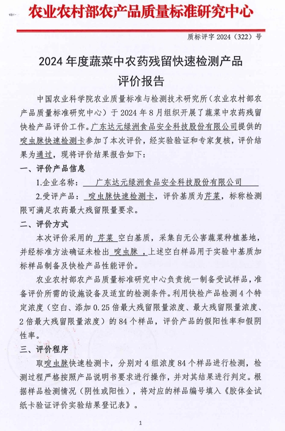 中國農業科學院農業質量標準與檢測技術研究所(農業農村部農產品質量標準研究中心)于2024年8月組織開展了蔬菜中農藥殘留快檢產品評價工作。廣東達元綠洲食品安全科技股份有限公司提供的三唑磷、氯氟氰菊酯、甲氨基阿維菌素苯甲酸鹽、滅多威、氟蟲腈、水胺硫磷、倍硫磷、毒死蜱、甲拌磷、啶蟲脒、克百威和三羥基克百威等11種快速檢測卡參加了本次評價,經實驗驗證和專家復核,11種產品全部通過驗證評價。