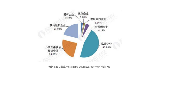 儀器儀表行業(yè)增速穩(wěn)定的另一面,是國內(nèi)外市場爭奪進(jìn)入白熱化階段,競爭較為激烈。截至2017年3月,我國規(guī)模以上儀器儀表制造企業(yè)有4311家。私營企業(yè)數(shù)量占比達(dá)到45.96%;外商及港澳臺投資數(shù)量占比24.68%;股份制企業(yè)數(shù)量占比為4.19%;國有企業(yè)數(shù)量占比2.28%;股份合作企業(yè)和集體企業(yè)數(shù)量占比分別為1.16%和0.70%。