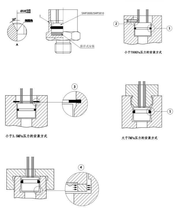 安裝方面,針對不同壓力范圍提供專屬方案,量程<7MPa、≥7MPa 各有適配結構,同時附帶詳細安裝注意事項,從公差配合到操作規范,全方位確保安裝正確,避免因不當操作影響性能。