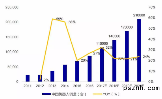 政策引導:國家層面先后頒布在《中國制 造2025》《機器人產業發展規劃(2016-2020年)》“工業強基工程”等政策,規劃到2020年我國工業機器人密度目標150臺/人,國內產量20萬臺、自主產量10萬臺,國家意志推動工業機器人產業發展。