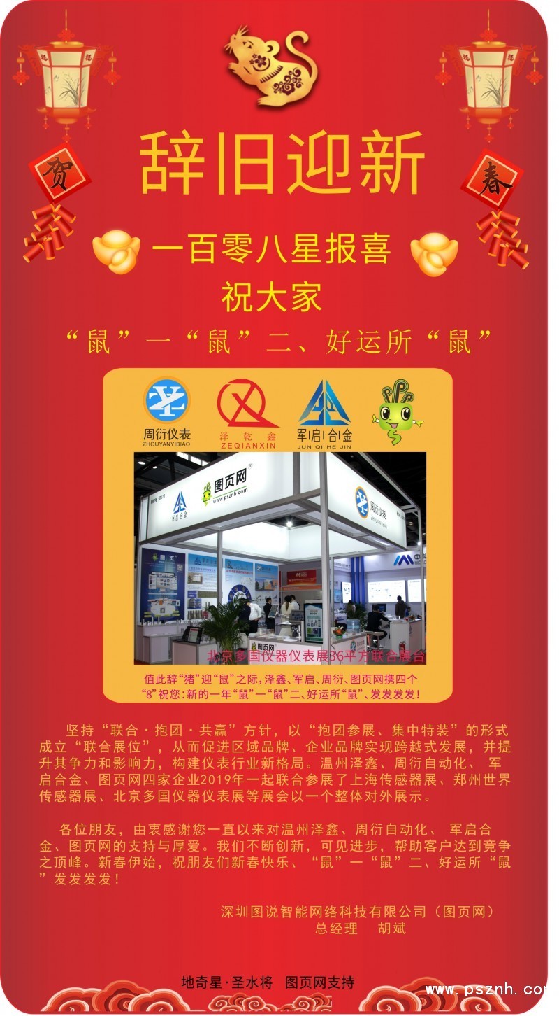 各位朋友,由衷感謝您一直以來對溫州澤鑫、周衍自動化、 軍啟合金、圖頁網(wǎng)的支持與厚愛。我們不斷創(chuàng)新,可見進(jìn)步,幫助客戶達(dá)到競爭之頂峰。新春伊始,祝朋友們新春快樂、“鼠”一“鼠”二、好運所“鼠 ”發(fā)發(fā)發(fā)發(fā)!