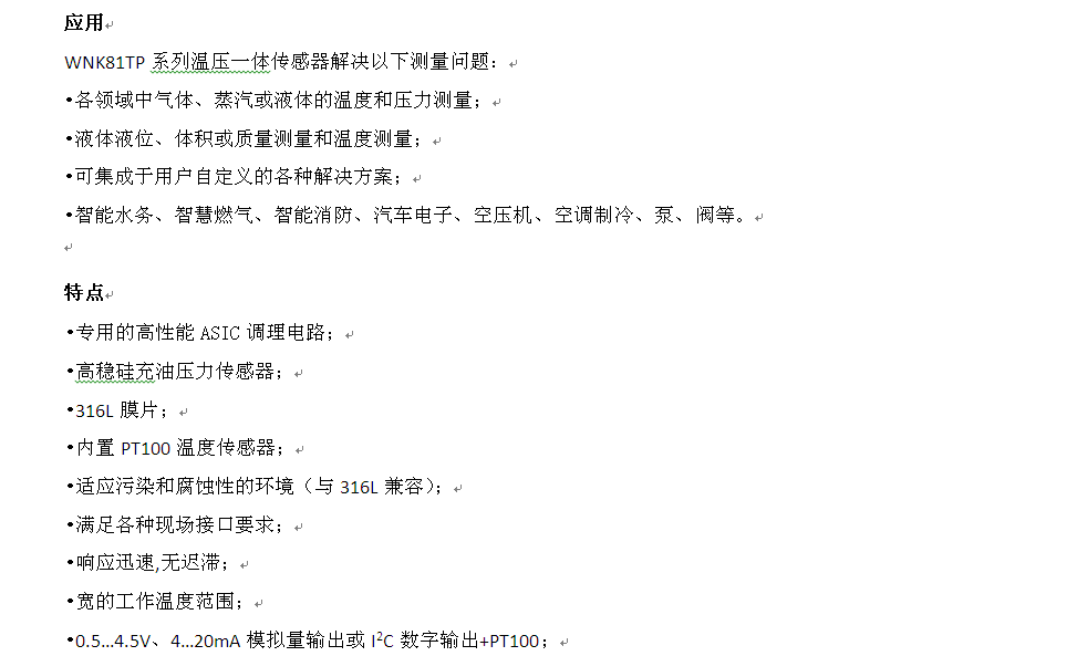 合肥皖科智能技術有限公司新推出WNK81TP型溫壓一體傳感器,是將溫度和壓力測量集成一體,節約了傳感器的材料成本和安裝空間,方便了現場用戶使用。該款產品可同時測試氣體或液體的壓力和溫度,廣泛應用于智能水務、智慧燃氣、智慧消防、汽車電子、空壓機、空調制冷、泵閥等。