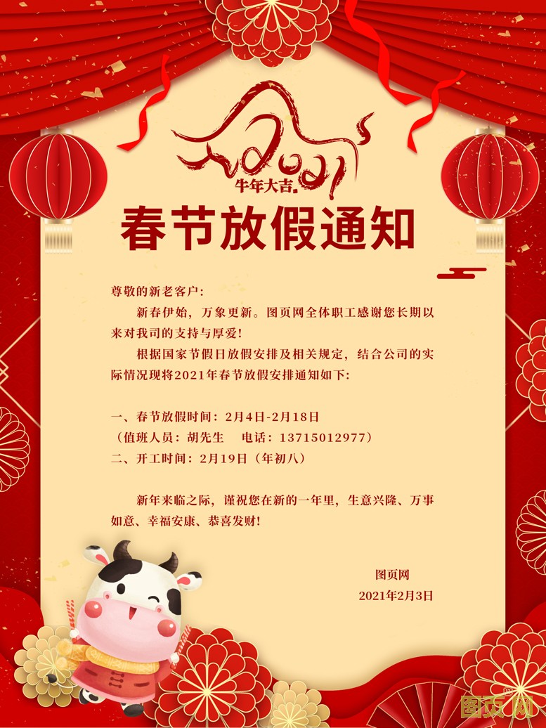 一、春節(jié)放假時間: 2月4日-2月18日 (值班人員:胡先生 電話: 13715012977)
