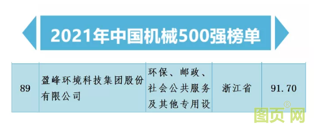 近日,2021年(第十九屆)中國機械500強研究報告發布會在北京舉行。會議上公布了中國機械500強企業名單,盈峰環境榜上有名,位列第89位,充分彰顯出公司強大的綜合實力和行業影響力。