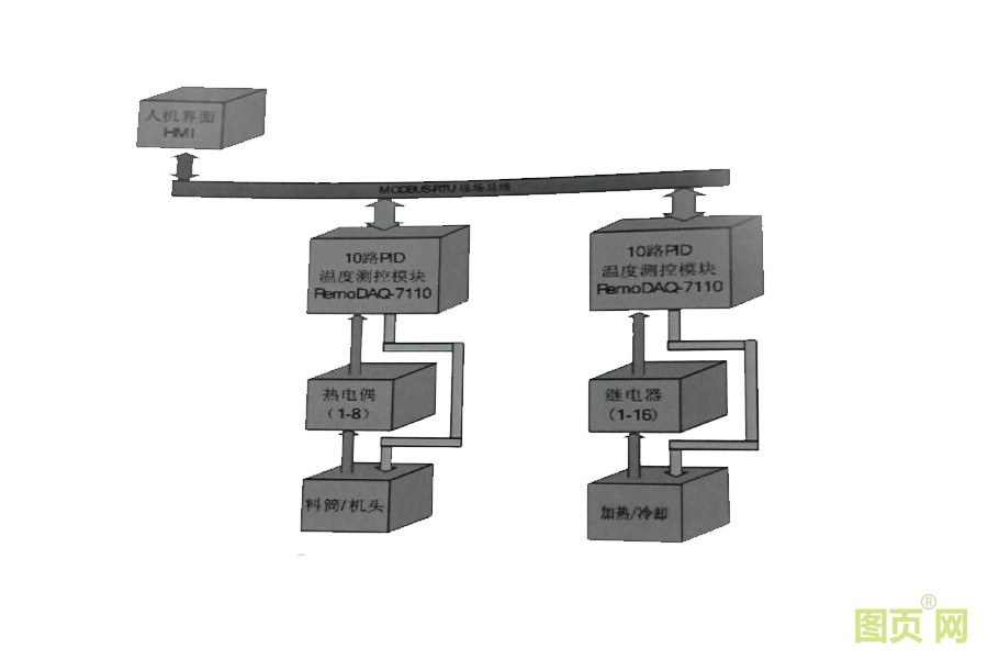 由圖中可以看出,由于模塊每回路均帶有熱電偶采集,加熱、冷卻開關量輸出。因此,只需要配置2個模塊。各看見塊可獨立的控制對應回路的溫度值,CPU只需通過現場總線就可以輕松的控制各回路的開閉及獲取各回路當前溫度設定溫度值。因此系統硬件和軟件大大簡化系統的控制精度可靠性、穩定性大幅進步。如下圖所示。