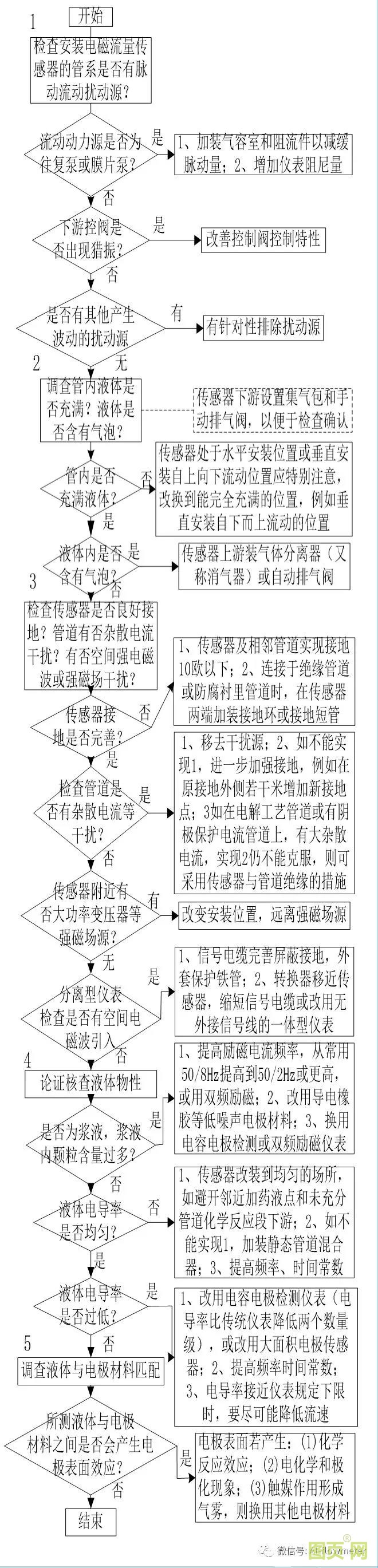 如上圖所示是檢查電磁流量計信號輸出晃動的流程。先按流程全面考慮作初步調查和判斷,然后再逐項細致檢查和調試排除故障。