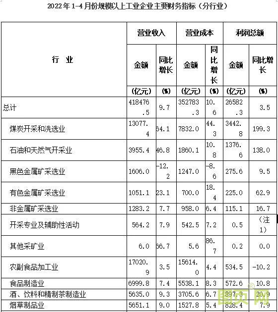 1-4月份,規模以上工業企業中,國有控股企業實現利潤總額9219.5億元,同比增長13.9%;股份制企業實現利潤總額19961.5億元,增長10.7%;外商及港澳臺商投資企業實現利潤總額6030.6億元,下降16.2%;私營企業實現利潤總額7651.4億元,下降0.6%。1-4月份,采礦業實現利潤總額5435.7億元,同比增長1.46倍;制造業實現利潤總額19819.2億元,下降8.3%;電力、熱力、燃氣及水生產和供應業實現利潤總額1327.3億元,下降29.3%。1-4月份,在41個工業大類行業中,19個行業利潤總額同比增長,20個行業下降,1個行業由虧轉盈,1個行業持平。主要行業利潤情況如下:煤炭開采和洗選業利潤總額同比增長1.99倍,石油和天然氣開采業增長1.38倍,有色金屬冶煉和壓延加工業增長40.3%,化學原料和化學制品制造業增長14.8%,電氣機械和器材制造業增長7.7%,非金屬礦物制品業增長2.9%,紡織業增長1.0%,專用設備制造業下降0.8%,計算機、通信和其他電子設備制造業下降2.9%,農副食品加工業下降10.2%,通用設備制造業下降24.0%,石油、煤炭及其他燃料加工業下降29.4%,電力、熱力生產和供應業下降33.0%,汽車制造業下降33.4%,黑色金屬冶煉和壓延加工業下降55.7%。1-4月份,規模以上工業企業實現營業收入41.85萬億元,同比增長9.7%;發生營業成本35.28萬億元,增長10.6%;營業收入利潤率為6.35%,同比下降0.38個百分點。4月末,規模以上工業企業資產總計146.02萬億元,同比增長10.4%;負債合計82.51萬億元,增長10.4%;所有者權益合計63.51萬億元,增長10.5%;資產負債率為56.5%,同比持平。4月末,規模以上工業企業應收賬款19.20萬億元,同比增長12.4%;產成品存貨5.79萬億元,增長20.0%。1-4月份,規模以上工業企業每百元營業收入中的成本為84.30元,同比增加0.70元;每百元營業收入中的費用為7.97元,同比減少0.51元。4月末,規模以上工業企業每百元資產實現的營業收入為87.1元,同比減少0.6元;人均營業收入為168.0萬元,同比增加14.4萬元;產成品存貨周轉天數為19.0天,同比增加1.3天;應收賬款平均回收期為54.5天,同比增加1.9天。
