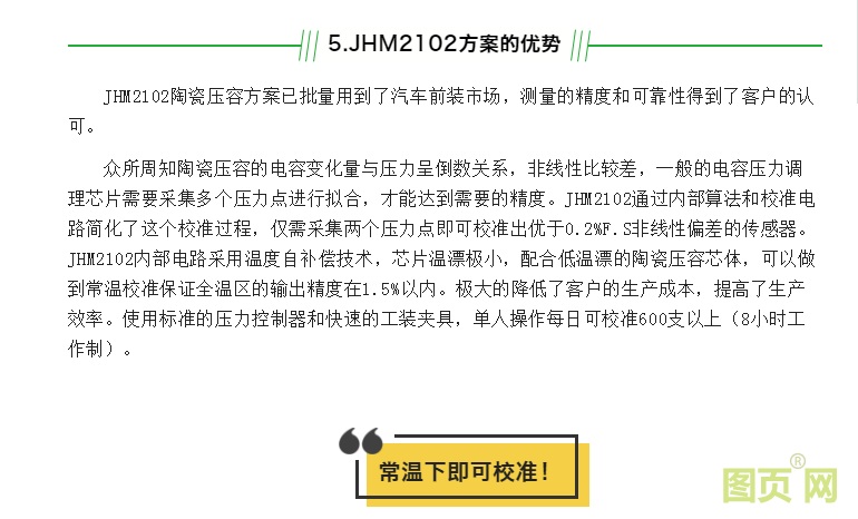 陶瓷壓容技術具有量程范圍寬、溫度特性好、可過載能力強、長期穩定性好等優勢。廣泛應用于冷媒、機油、剎車、燃油等壓力測量。陶瓷壓容芯體有很好的溫度特性,例如2MPa的芯體每100℃溫漂優于0.5%F.s。搭配久好電子的JHM2102僅需要常溫兩點校準,就可以做到-40~125℃溫區內1.5%F.S以內的精度。