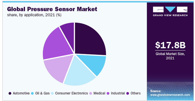 GrandView Research數據也證明了這點:2021年全球壓力傳感器市場規模達178.1億美元,主要受益于工業大本營之外的消費電子、汽車和便攜式可穿戴設備等對壓力傳感器需求的增長。而且,這波增長勢頭不減,自2022年至2030年,將繼續推動全球壓力傳感器市場以4.4%復合年增長率繼續穩步前行。