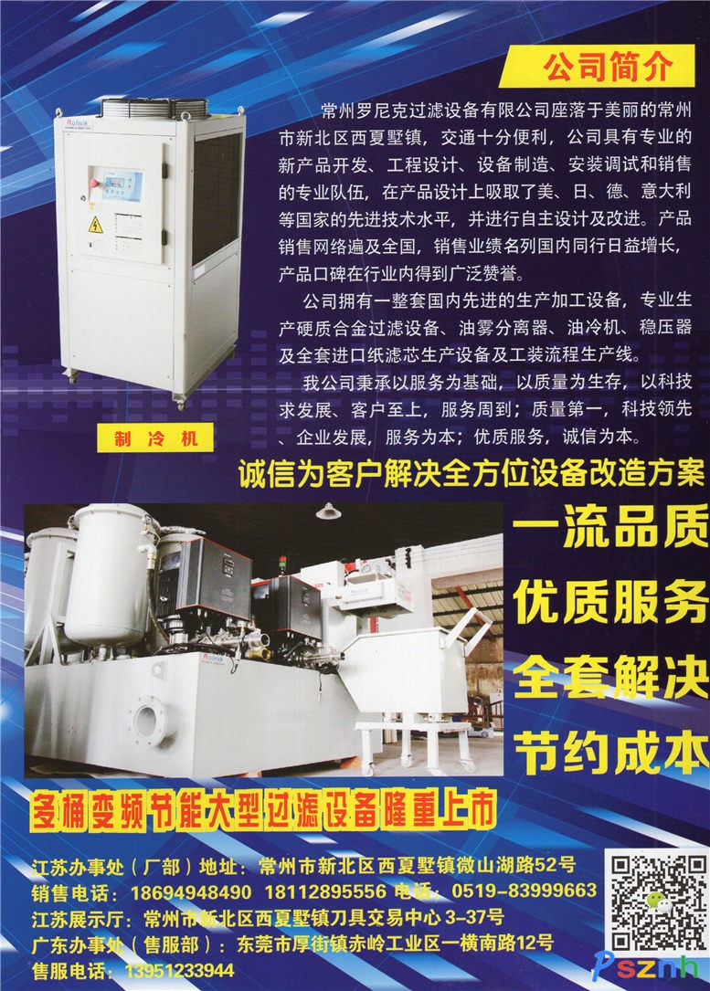 常州羅尼克過濾設備有限公司專業制造過濾設備,更換濾芯,進口紙濾芯,及靜電式油霧分離器,機床穩壓器,工業專用冷油機,制冷機,